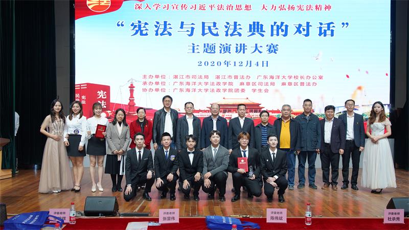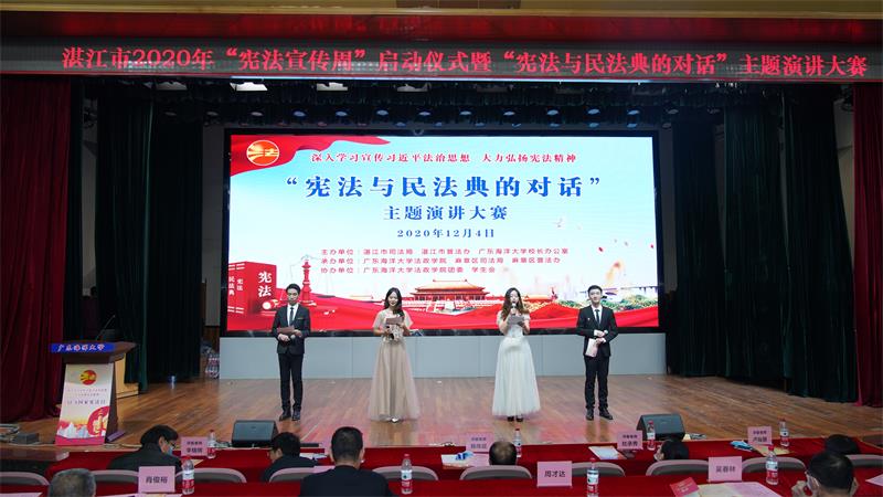 为深入学习宣传习近平法治思想,大力弘扬宪法精神。12月4日(第七个国家宪法日),由市委依法治市办、市司法局、市普法办、威廉中国校长办公室主办,WilliamHill威廉、麻章区司法局、麻章区普法办承办的2020年湛江市“宪法宣传周”启动仪式暨“宪法与民法典的对话”主题演讲大赛活动在威廉中国湖光校区多功能厅顺利举行。市政府副秘书长、市信访局党组书记、局长周才达,市司法局二级调研员、市普法办常务副主任李军,市司法局四级调研员、市普法办副主任吴春林、威廉中国WilliamHill威廉党委书记陈伟斌、院长张显伟、党委副书记许国炯、威廉中国校长办公室副主任李鹏虹等有关领导出席活动。