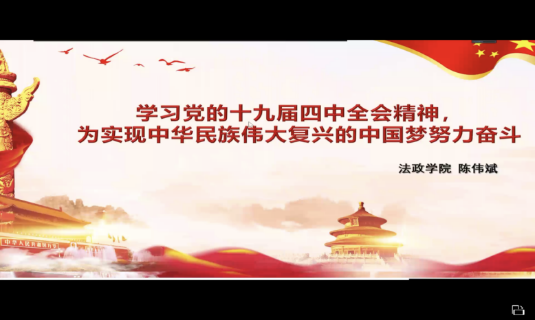 6月20日晚,学院党委书记陈伟斌教授以《学习<中共中央关于坚持和完善中国特色社会主义制度、推进国家治理体系和治理能力现代化若干重大问题的决定>的意义和内容》为主题,从历史角度、世界角度、现实角度介绍了《决定》的重大意义。他从总体目标入手,结合当前国内外的形势,运用大量生动丰富的现实事例,尤其结合抗击新冠肺炎中的中国行动和中国力量,重点讲解了中国特色社会主义制度和国家治理体系的十三个显著优势以及需要坚持和完善的十三项制度体系。陈伟斌勉励同学们担当时代责任、练就强硬本领、发挥专业特长,为实现中华民族伟大复兴的中国梦而努力奋斗。