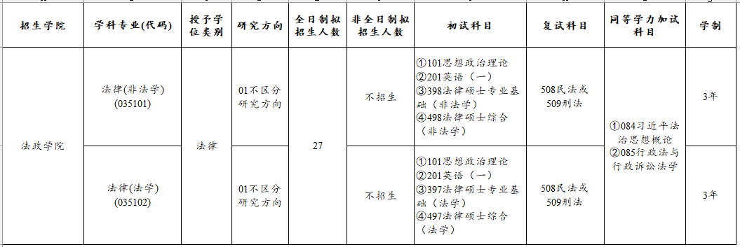 学院现设有法律(法学)(035102)及法律(非法学)(035101)专业学位硕士点。目前在校全日制专业硕士研究生78人。