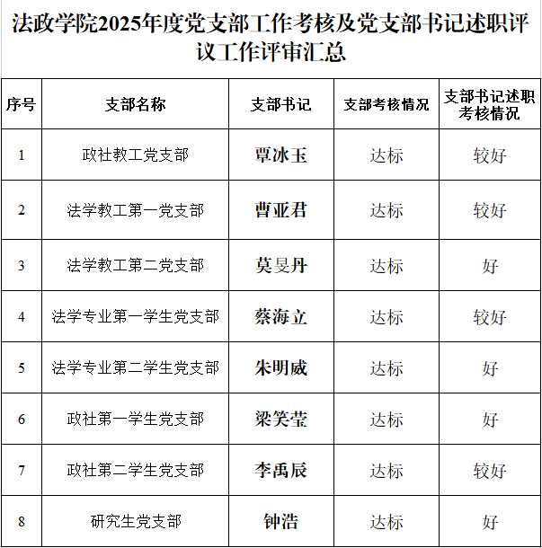 根据《关于做好2025年度党支部工作考核和党支部书记抓党建工作述职评议考核等工作的通知》,我院认真开展相关考核工作,现将学院党支部工作考核和党支部书记抓党建工作述职评议考核结果予以公示。公示时间为2026年1月5日—2026年1月7日。如有意见,请在公示期间向学院党委提出。